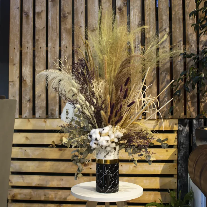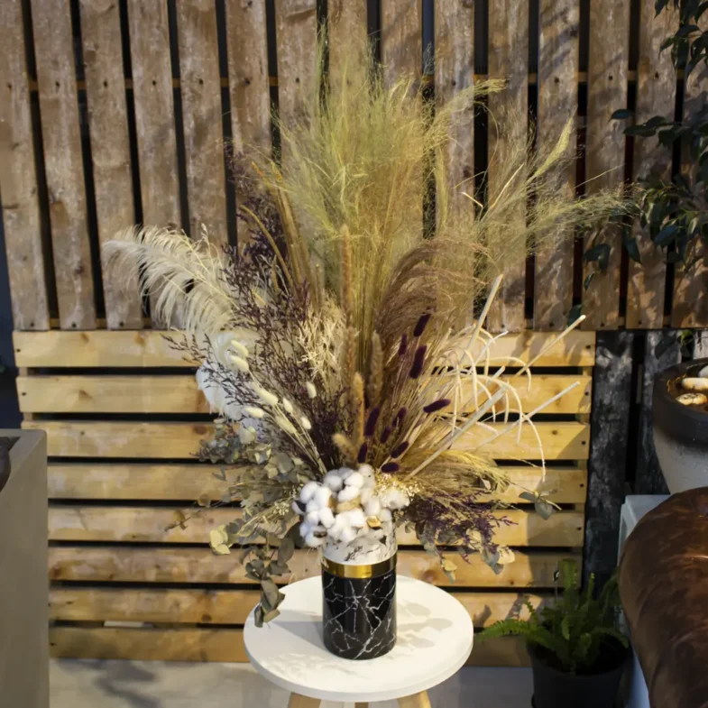 Our expert florists arrange the grass and cotton in a clear vase, allowing the beauty of each stem to shine through. Not only is our Rustic Charm in black crystal vase arrangement visually stunning, but it’s also incredibly easy to care for.